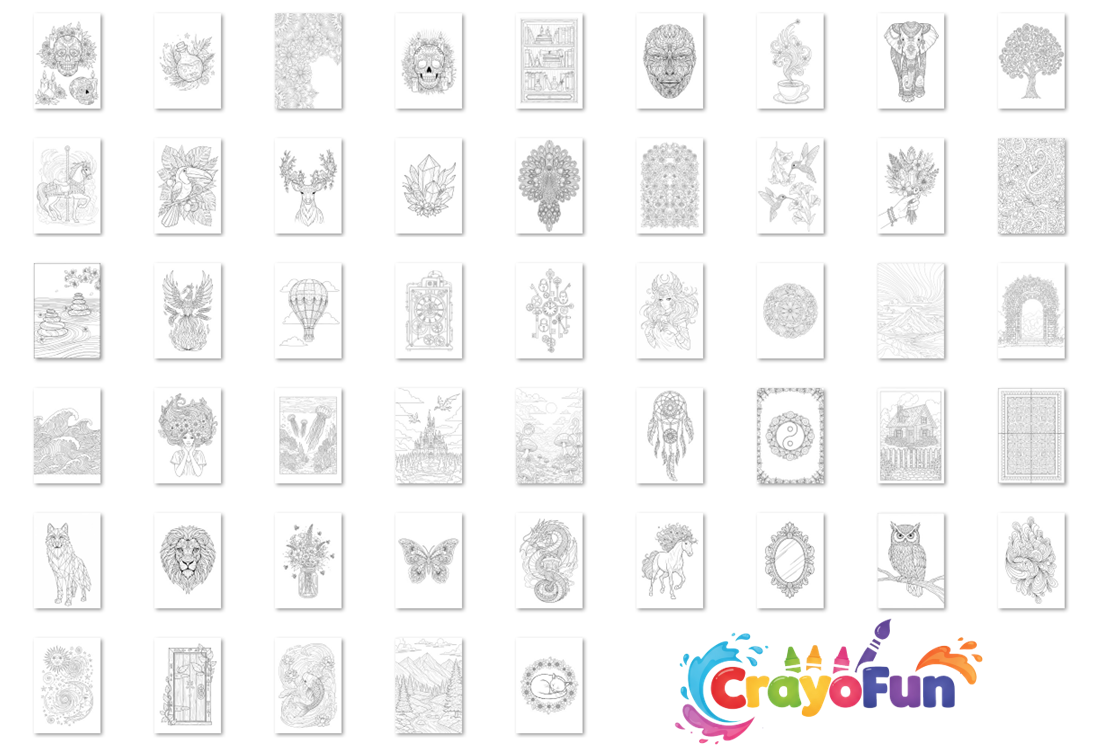 • A variety of themes: mandalas, florals, animals, fantasy, landscapes, and more.